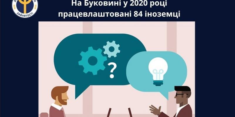 На Буковині у 2020 році до обласної служби зайнятості роботодавці подали пакети документів для працевлаштування 84 іноземців. Більшість громадяни Румунії – 30 осіб, Туреччини – 17 осіб, Таджикистану – 12 осіб, Італії – 5 осіб. Також дозволи отримали іноземці з Індії, Ізраїлю, Польщі, Білорусії, Болгарії, Греції, Великобританії та США.