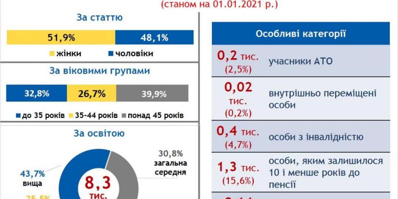 Станом на 1 січня 2021 року статус безробітного мали 8300 осіб. Вони звернулися до обласної служби зайнятості по допомогу у пошуку роботи.