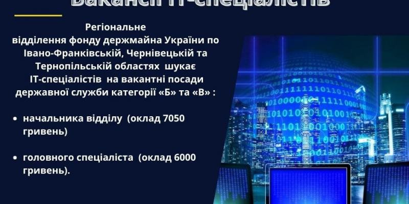 Регіональне відділення фонду держмайна України по Івано-Франківській, Чернівецькій та Тернопільській областях шукає ІТ-спеціалістів на вакантні посади державної служби категорії «Б» та «В»