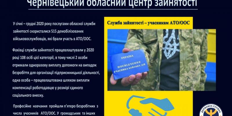 У січні – грудні 2020 року послугами обласної служби зайнятості скористалися 515 демобілізованих військовослужбовців, які брали участь в АТО/ООС, та отримали статус безробітного, з них мали право на допомогу на випадок безробіття 495 осіб.