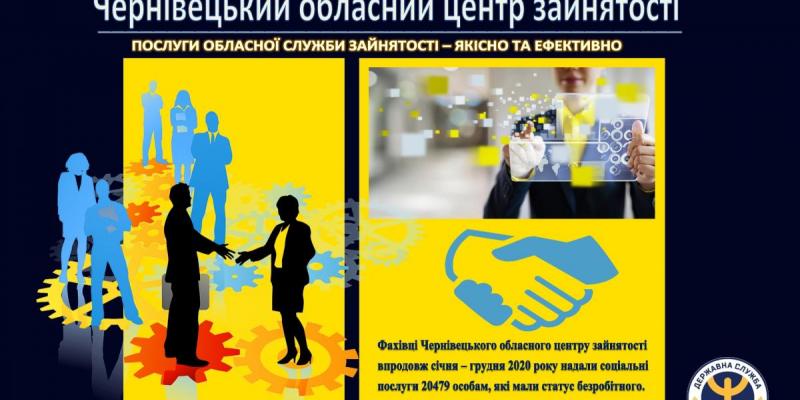 Фахівці Чернівецького обласного центру зайнятості впродовж січня – грудня 2020 року надали соціальні послуги 20479 особам, які мали статус безробітного. За минулий рік такий статус отримала 14591 особа.