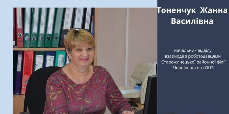Жанна Тоненчук, начальник відділу взаємодії з роботодавцями Сторожинецької районної філії обласного центру зайнятості, у службі зайнятості працює з 1991 року.