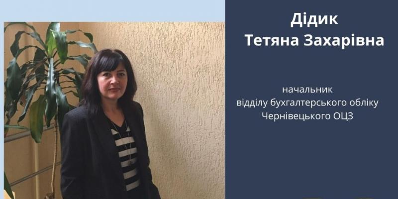 Тетяна Дідик, начальник відділу бухгалтерського обліку Чернівецького обласного центру зайнятості, працює у службі зайнятості з 1991 року. Прийшла на роботу 18 річною дівчиною, а перше робоче місце стало сходинкою до успішної реалізації кар’єри як бухгалтера.