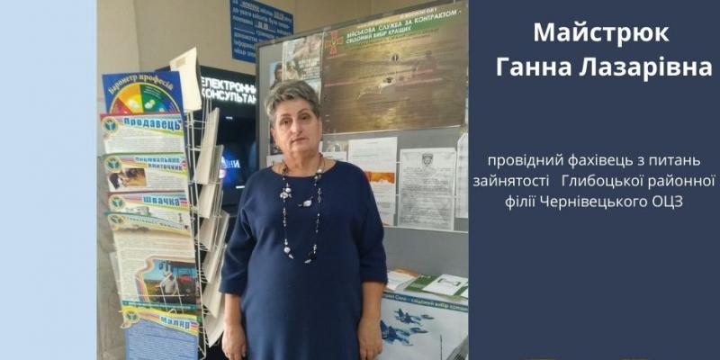 Майстрюк Ганна Лазарівна, провідний фахівець з питань зайнятості відділу організації працевлаштування населення Глибоцької районної філії Чернівецького обласного центру зайнятості. Працює у службі зайнятості з часу її створення.