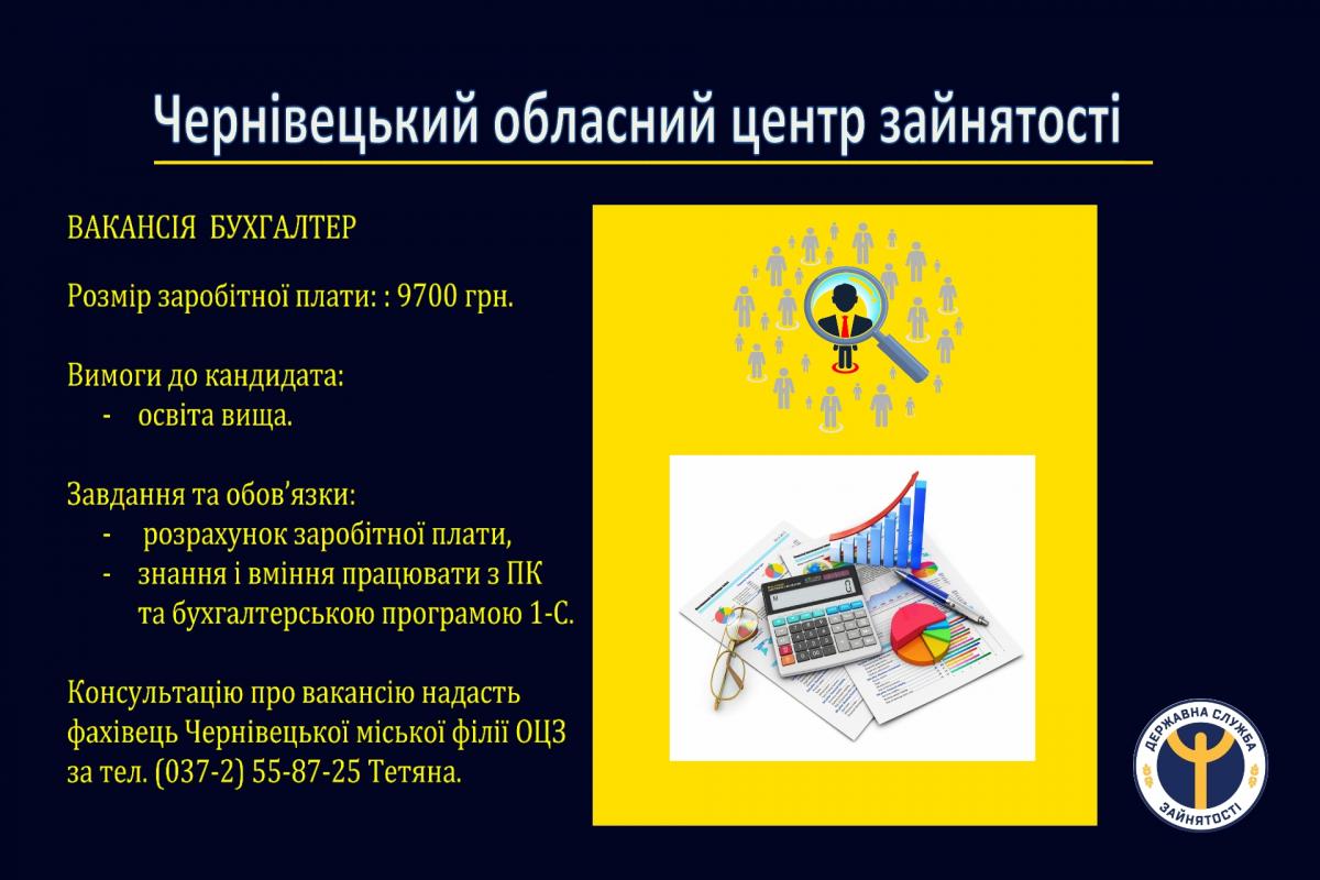 Консультацію про вакансію надасть фахівець Чернівецької міської філії ОЦЗ за тел. (037-2) 55-87-25 Тетяна.