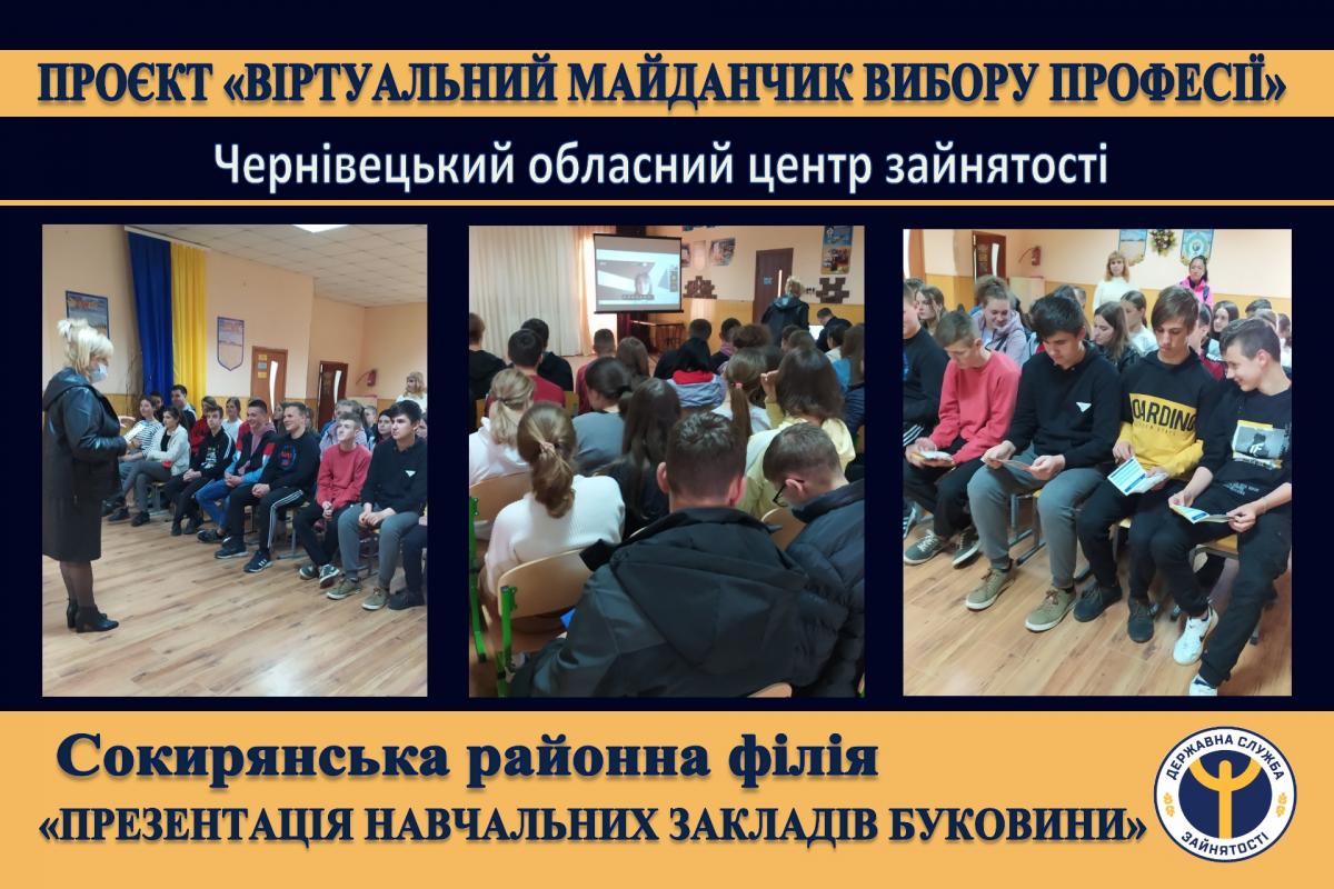 19 травня 2021 року в рамках проєкту Чернівецького ОЦЗ «Віртуальний майданчик вибору професій» фахівці служби зайнятості організували та провели профорієнтаційний захід «Презентація навчальних закладів Буковини» для учнів Сокирянської гімназії.