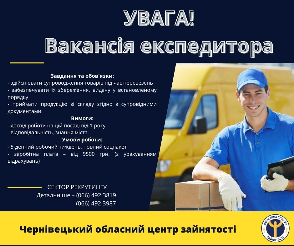 Фахівці сектору рекрутингу Чернівецької міської філії ОЦЗ шукають експедиторів на вільні вакансії із зарплатою 9500 гривень.