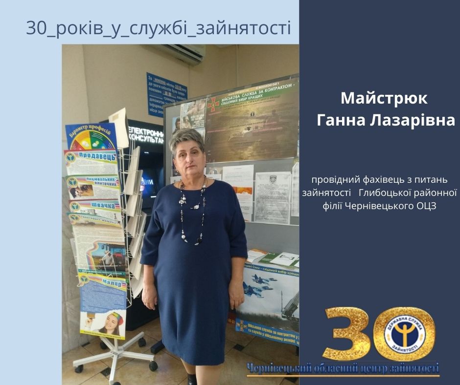 Майстрюк Ганна Лазарівна, провідний фахівець з питань зайнятості відділу організації працевлаштування населення Глибоцької районної філії Чернівецького обласного центру зайнятості. Працює у службі зайнятості з часу її створення.