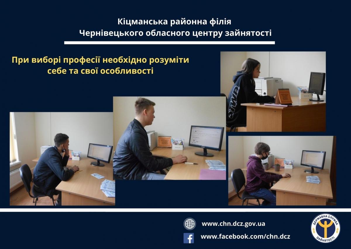 Після проведених профорієнтаційних уроків «Ринок праці. Складові успішного вибору» випускники 9-х класів Кіцманського закладу загальної середньої освіти завітали до Кіцманської районної філії Чернівецького обласного центру зайнятості для проходження профорієнтаційного тестування. Діти старанно відповідали на запитання, а відтак активно обговорювали результати.