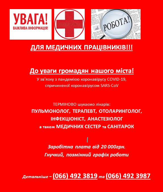 У зв'язку з пандемією коронавірусу COVID-19, спричиненої коронавірусом SARS-CoV заклади охорони здоров’я терміново потребують медичних працівників.
