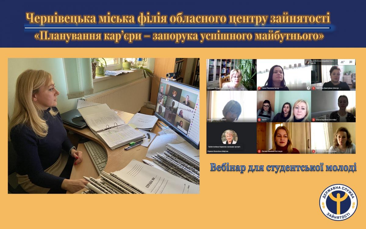 Чернівецька міська філія обласного центру зайнятості продовжує працювати дистанційно з студентами вишів та учнями ПТНЗ міста. 24 листопада 2020 в межах проєкту «Планування кар’єри – запорука успішного майбутнього» фахівці служби зайнятості провели вебінар за участю викладачів та студентів Чернівецького національного університету імені Ю. Федьковича.