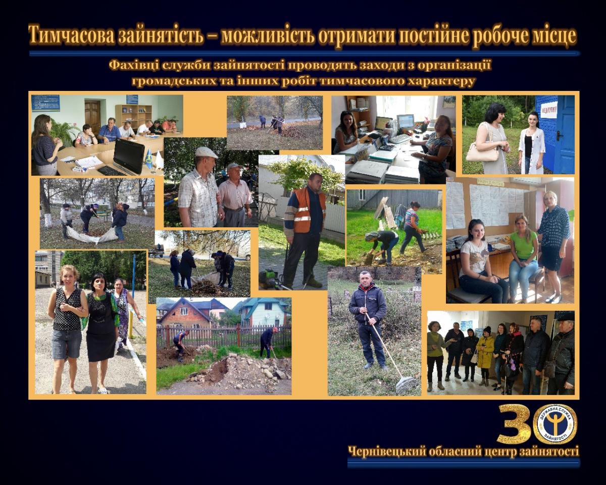 У 2020 році за сприяння Чернівецької обласної служби зайнятості 869 осіб долучилися до оплачуваних громадських робіт (136 осіб) та робіт тимчасового характеру (730 осіб). Після закінчення громадських робіт та інших робіт тимчасового характеру 336 осіб отримали постійну роботу.