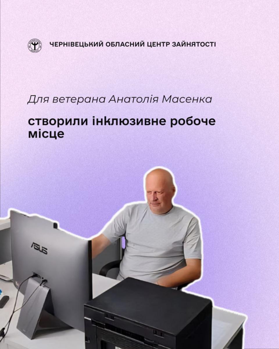 Анатолій пройшов конкурсний відбір і нині працює в Комунальному некомерційному закладі «Центр надання соціальних послуг» Горішньошеровецької сільської ради. Щоб ветерану з інвалідністю було зручно працювати та ефективно виконувати свої обов’язки, йому облаштували робоче місце.