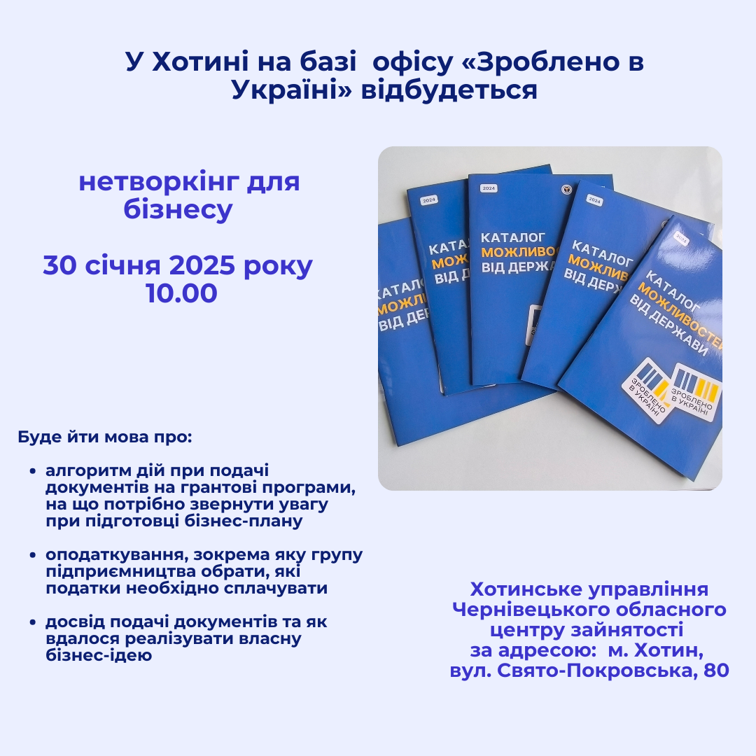 30 січня 2025 року о 10.00 год у Хотинському управлінні Чернівецького обласного центру зайнятості на базі офісу – центру роботи з мікро- та малим бізнесом «Зроблено в Україні» відбудеться неформальний нетворкінг як для представників бізнесу так і осіб, які хочуть скористатися грантовими програмами.