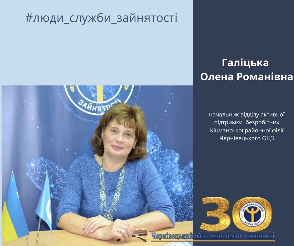 Галіцька Олена Романівна, начальник відділу активної підтримки  безробітних Кіцманської районної філії Чернівецького ОЦЗ, працює в службі зайнятості з 1993 року.