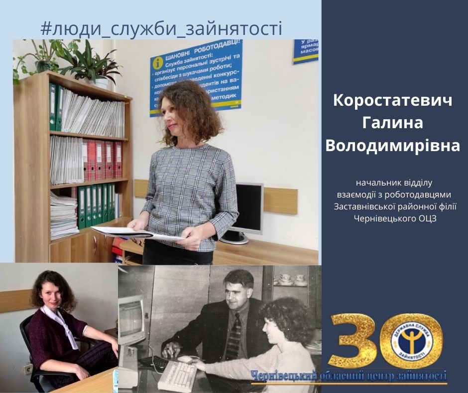 Галина Коростатевич, начальник відділу взаємодії з роботодавцями Заставніської районної філії, працює у службі зайнятості із червня 1998 року. Спочатку - спеціалістом у відділі сприяння працевлаштуванню, потім – у відділі бухгалтерського обліку, а згодом – очолила відділ взаємодії з роботодавцями.