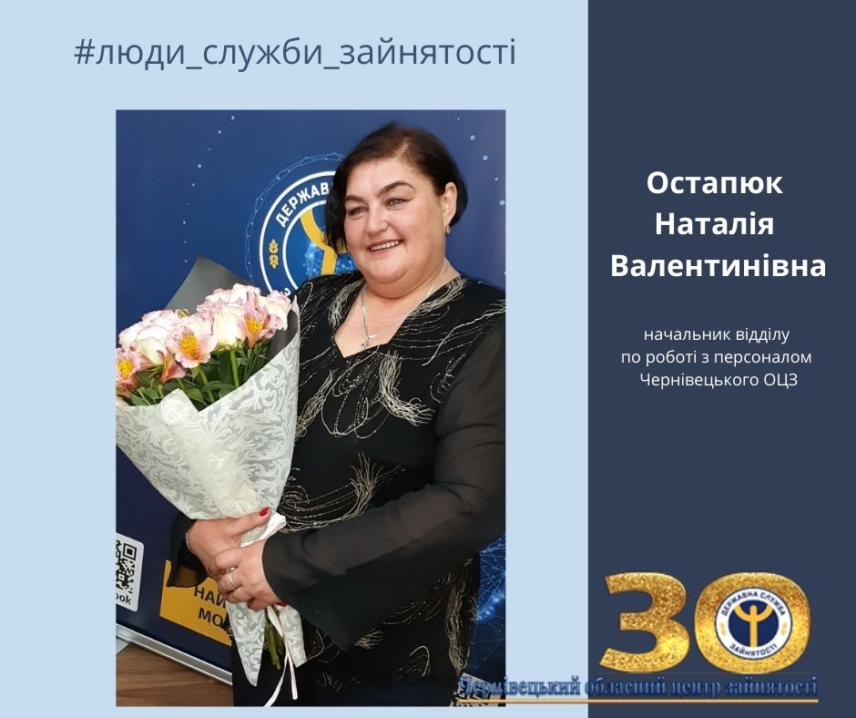 Остапюк Наталія Валентинівна, начальник відділу по роботі з персоналом Чернівецького обласного центру зайнятості, працює у службі зайнятості з 1992 року. Розпочинала працювати секретарем, потім спеціалістом, згодом завідувачем канцелярії та начальником по роботі з персоналом.