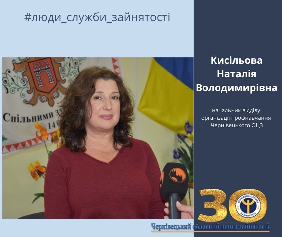 Наталія Кисільова, начальник відділу організації профнавчання Чернівецького обласного центру зайнятості, працює у службі зайнятості з 1994 року. За цей час вдалося долучитися до створення дієвої системи організації професійного навчання дорослого населення (зареєстрованих безробітних), якої раніше не було в Україні. Налагоджено та відпрацьовано співпрацю з закладами освіти Чернівецької області, в яких крім учнів та студентів почали навчатися слухачі – безробітні, які проходили навчання за направленням державної служби зайнятості.