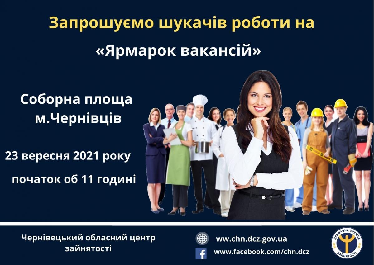 23 вересня 2021 року об 11 годині на Соборній площі м.Чернівців Чернівецька обласна служба зайнятості проводить «Ярмарок вакансій».